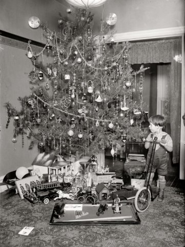 Perhaps the most notable trend to emerge during the 20s was that of electric lights for the tree. Prior to this period, candles were still widely used to light the Christmas tree. Although these lights would not be extensively used in average households until 1930, the 20s saw increased use not only in households but by big businesses in their holiday displays. Urban migration was in full swing thanks in part to wide-spread use of automobiles, and businesses had to catch the attention of patrons amid the hustle and bustle of the Roaring 20s.