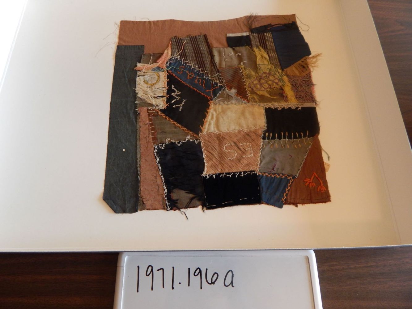 The style of quilting shown in the photograph above is called “Crazy Quilts.” Crazy Quilts were very popular in the late 1800s and early 1900s. The name of these types of quilts make sense when you look at the irregular shapes, changing fabric, and lovely embroidery. These are considered to be one of a kind quilts. According to American Patchwork and Quilting. “Philadelphia’s 1876 Centennial Exposition is also considered a dynamic influence in crazy-quilt design. At the entrance to the most popular Japanese Pavilion, the image of a priest on a paved road introduced the concept of asymmetry to more than ten million people who attended. A cracked-ice, mosaic pattern on the path as well as other unfamiliar art forms—with images of storks, owls, fans, and flowers—were exotic attractions for Americans. They had become enchanted with anything Oriental and were replicating the look in their art, including quilts, dinnerware, furniture, and other decorations.” The Molly Brown House Museum possesses two quilt blocks that can be described as Crazy Quilts. The first quilt block that we have in our collection (seen above) is made of cotton, satin, and velvet and contains peaches, reds, blues, browns and yellows in the patches. The quilt patch contains multi-colored stitching of the letters of the alphabet, as well as the words “mama” and “papa” and hand-stitched flowers. The backing of the quilt is blue cotton with white flowers. The second quilt block that we have in our collection (see below) is made of cotton and satin. It contains patches of browns, blues, yellows, and purples. This patch has orange stitching with the phrases “ES,” “YW,” and “XMAS” sewn into the quilt.